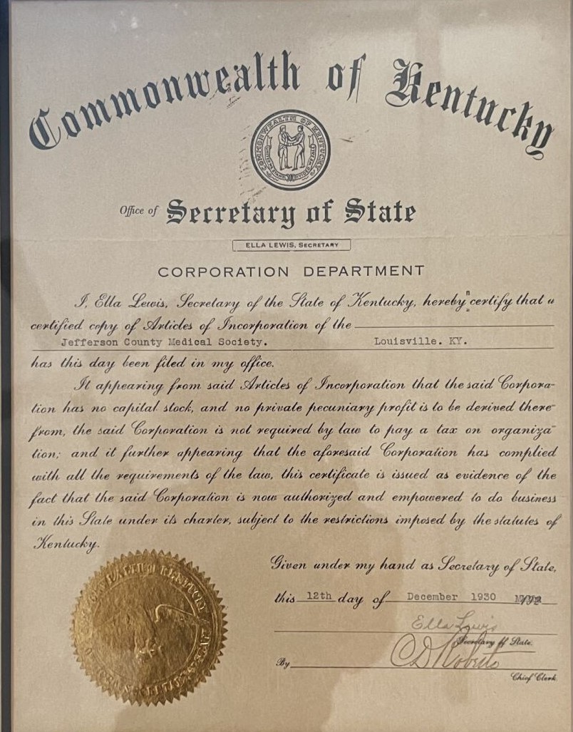 This document certifies the incorporation of the Jefferson County Medical Society. Issued on December 12, 1930, by Secretary of State Ella Lewis.