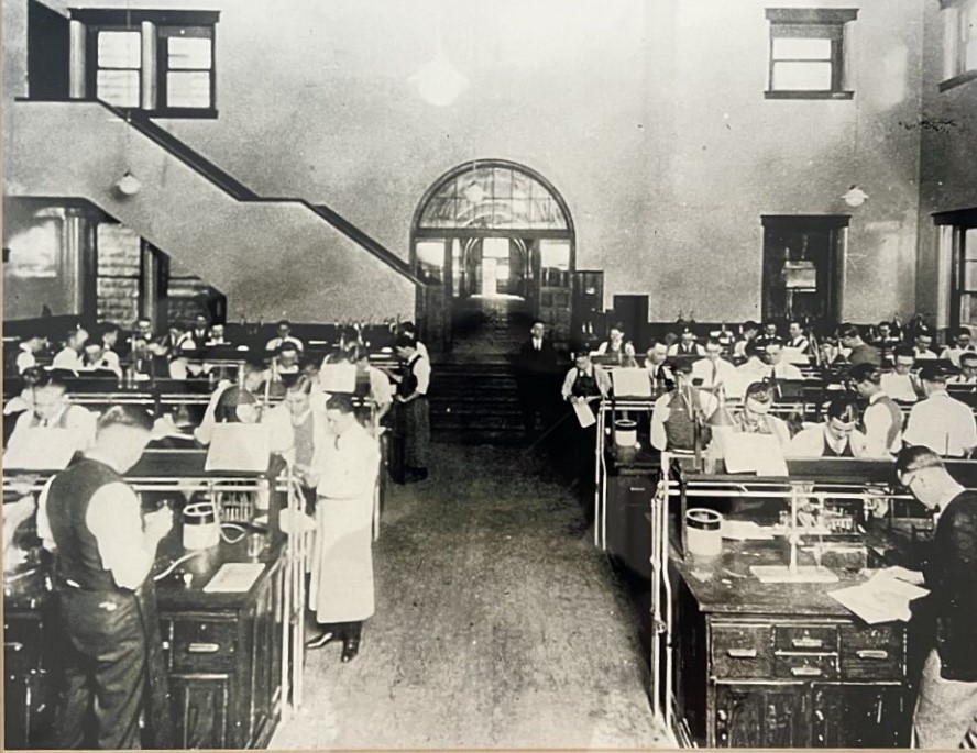 This photograph, taken in 1922, shows the Physiological Chemistry Laboratory under the direction of Dr. Hays. In 1923, he was succeeded by the renowned research physiologist Dr. Barbour. The laboratory was located on the first floor, just past where the elevators are now, in the current Ronald McDonald House Building.