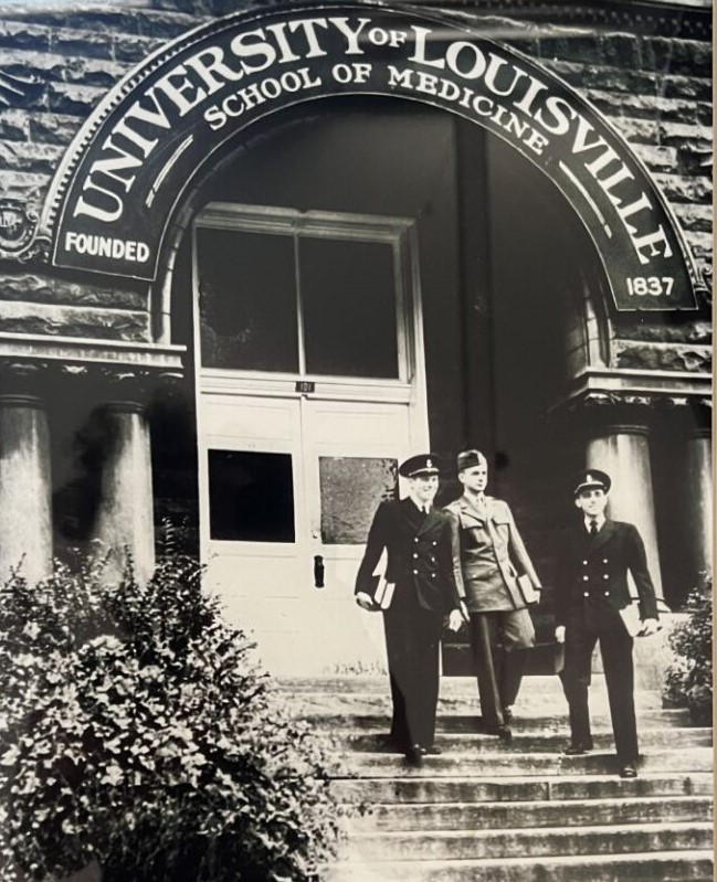 During World War II, the University of Louisville partnered with the Government to educate students for the Armed Forces. The curriculum was adapted to focus on military medicine. This photograph captures two men from the 1557th Army Service Unit and one from the Navy V-12 Unit stationed on the university campus.